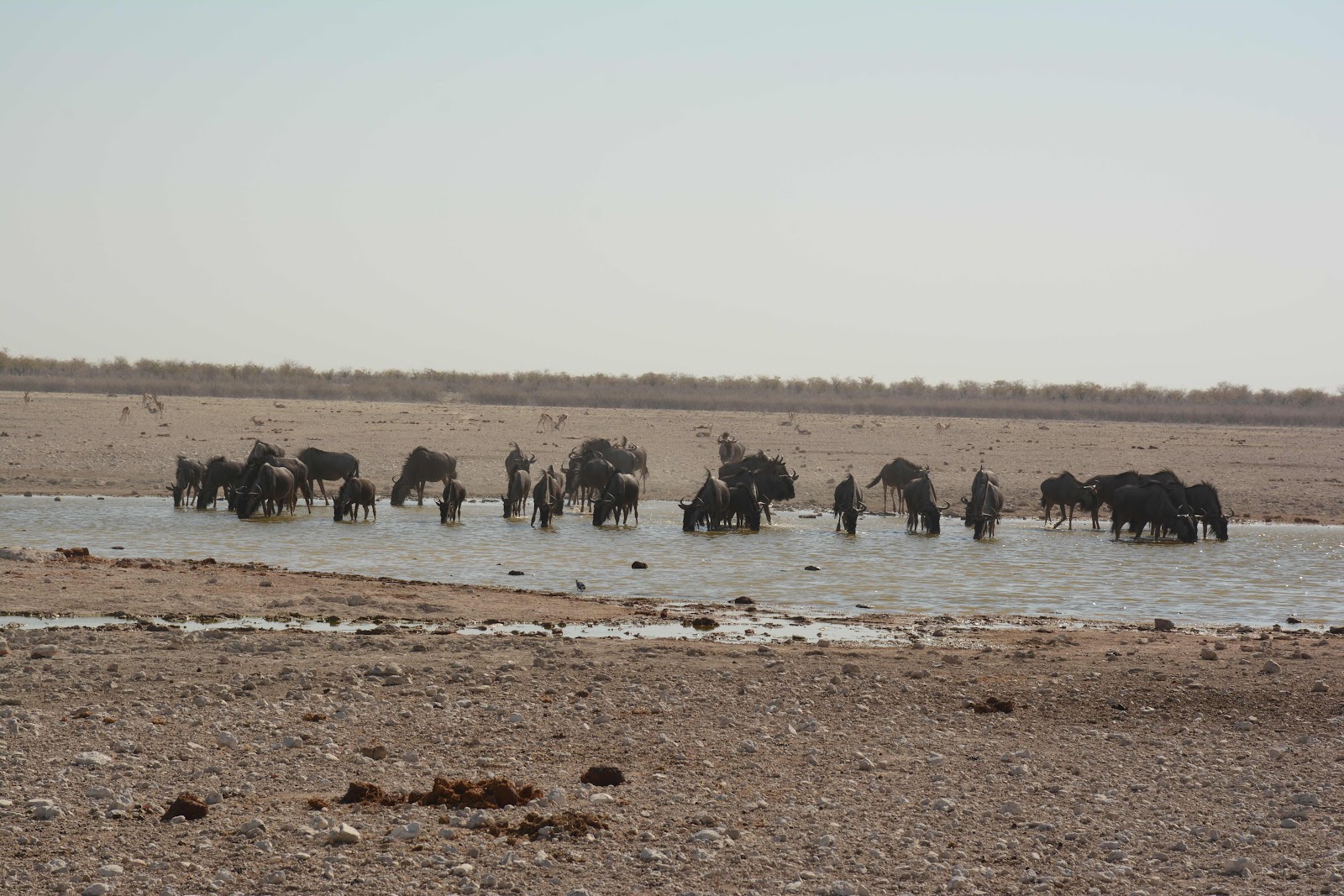 Lo primero hemos visto los ñus en fila con los bebés en el medio, pisando huevos para ir a beber a la charca. A mi me parecen muy tontos.